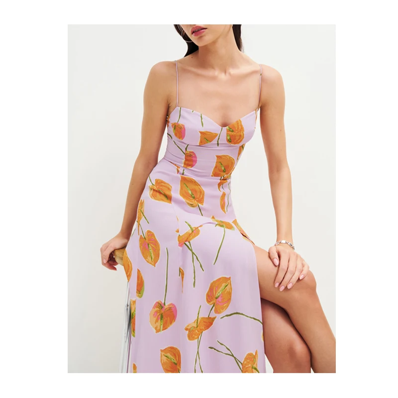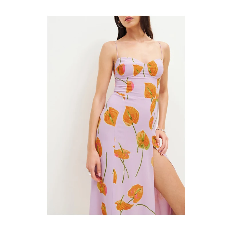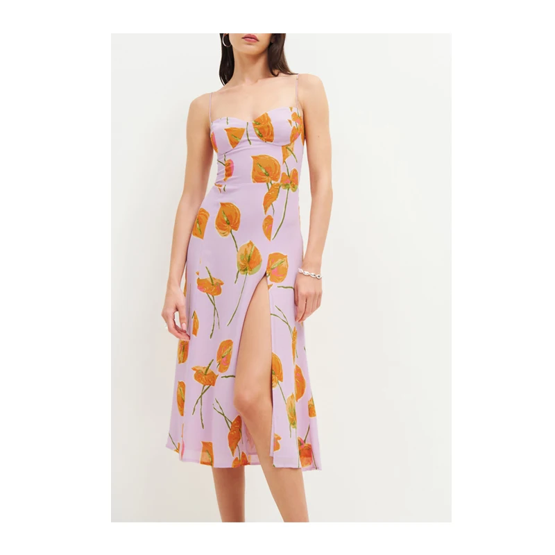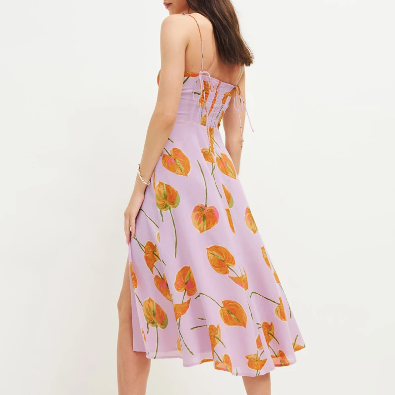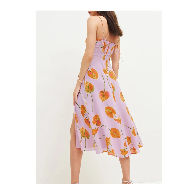 Spaghetti Straps Tie Back Customize Floral Printed Lady's Summer Midi Dresses
